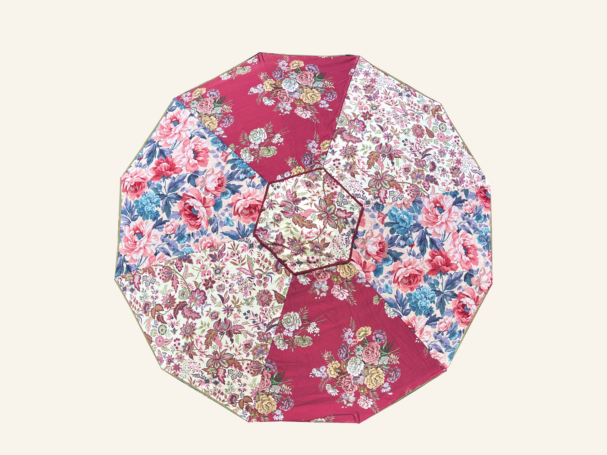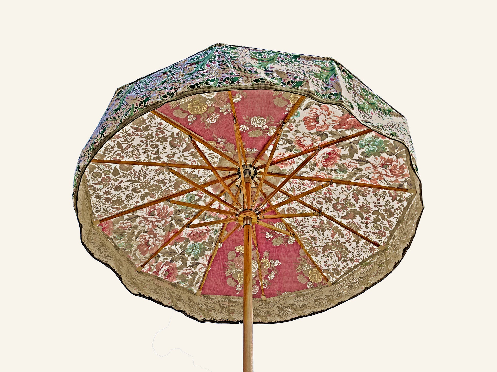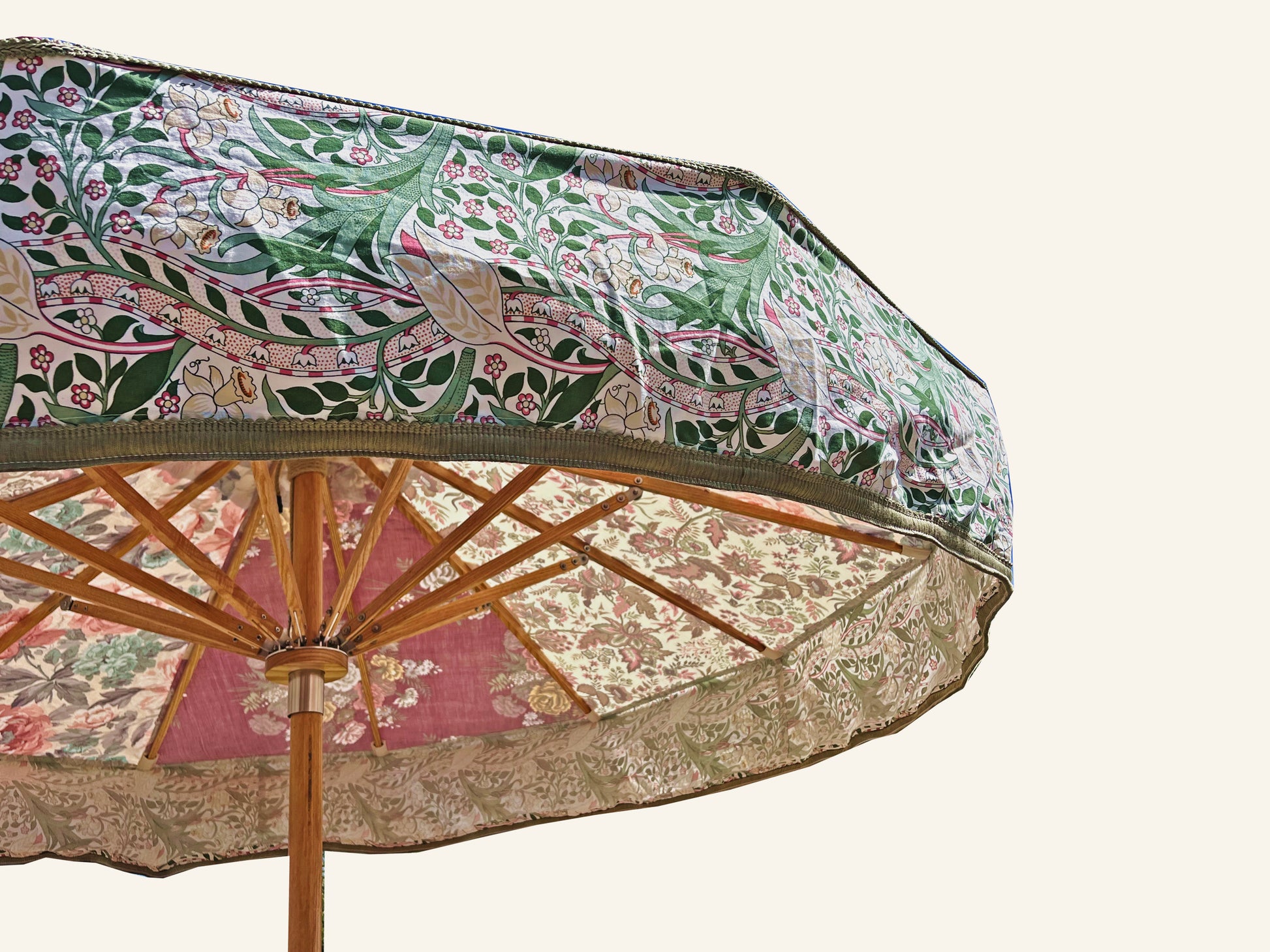 Each and every parasol is a unique piece, a one-off work of art. The fabrics are sourced and curated by Katy Napier. The parasol frames are made using Sunbeam Jackie’s unique parasol design incorporating; hand-oiled ash timber components all machined in Cornwall, stainless steel mechanisms welded and polished by a marine welder in Falmouth and assembled by Charlie and his team in the Sunbeam Jackie C12th grain store, uniquely situated in the heart of Cornwall’s UNESCO world heritage site.